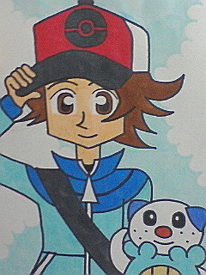 トウヤが、初めてのパートナーとなるポケモン、ミジュマルと一緒に、旅の始まりだ!というコンセプトで描きました。