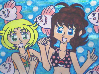 と言っているイメージです。このイラストはママンボウが描きたくて描いたようなものだから、ある意味ママンボウがメインです~。だけど、トウコとベルが可愛く描けて満足♪特にベルのおっぱいが描けて楽しかったなぁ(苦笑)