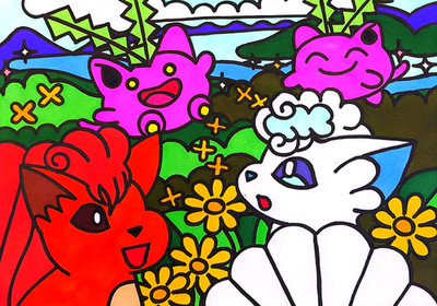 ポケモンの絵が描かれたマンホール蓋『ポケふた』の北海道美幌町にあるロコンとアローラロコンとハネッコのポケふたのイラストを模写してみました。