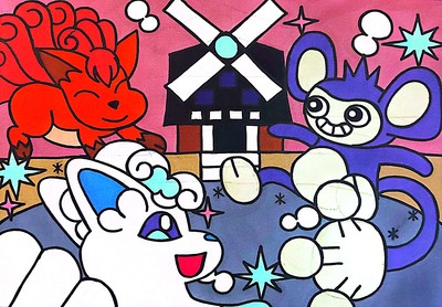 ポケモンの絵が描かれたマンホール蓋『ポケふた』の北海道猿払村にあるロコンとアローラロコンとエイパムのポケふたのイラストを模写してみました。
