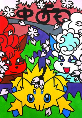 ポケモンの絵が描かれたマンホール蓋『ポケふた』の北海道歌志内にあるロコンとアローラロコンとバチュルのポケふたのイラストを模写してみました。