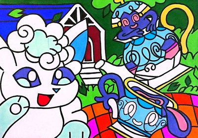 ポケモンの絵が描かれたマンホール蓋『ポケふた』の北海道当別町にあるアローラロコンとヤバチャとポットデスのポケふたイラストを模写してみました。