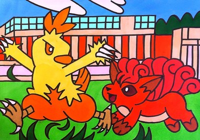 ポケモンの絵が描かれたマンホール蓋『ポケふた』の北海道中標津町にあるロコンとワカシャモのポケふたイラストを模写してみました。