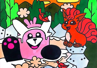 ポケモンの絵が描かれたマンホール蓋『ポケふた』の北海道登別市登別市登別港町にあるロコンとキテルグマのポケふたイラストを模写してみました。