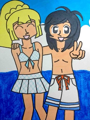 私が書いた短編小説「カルテット・デート」のその後、海で遊ぶヨウとリーリエ、というイメージで描きました。