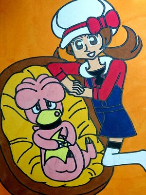 育て屋の夫婦が預かって育てているブーバーンの♂とブーバーンの♀がタマゴを産んでそのタマゴから孵ったばかりの生まれたてのブビィをあやすコトネ、というコンセプトで描いてみました。なのでこのコトネは女主人公としてのコトネではなくヒビキを主人公に選んだ場合のNPCとして登場する育て屋夫婦の孫のコトネです。