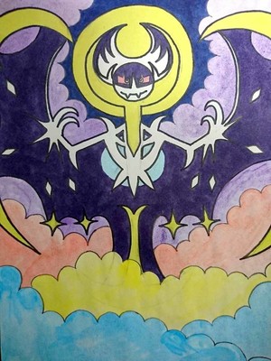 月を誘いし獣、ルナアーラです。伝説のポケモンらしい壮大な感じを出したかったのですが私の絵柄のせいで全然そうは見えないですね(^_^;)
