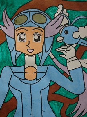 木の街ことヒワマキシティの大自然の中で仲良く戯れるナギとチルットです。マイナスイオン的な感じを表現したくて背景の緑は水彩色鉛筆を塗った後に水でとかして描きました。