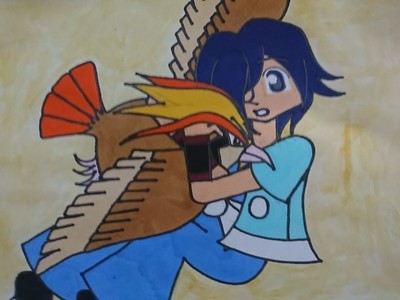 傷付いて弱って飛ぶ力が弱くなったピジョットをハヤトが抱きしめて介抱している、という構図で描きました。