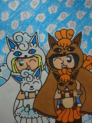 以前ポケモンセンターサッポロのリニューアルオープン記念として全国のポケモンセンター、ポケモンストアで「アローラロコンとゆきまつり」を開催していた事から原種ロコンのポンチョを着たヨウ、アローラロコンのポンチョを着たリーリエ、そしてヨウがカントー地方でゲットしたロコンとリーリエがサンムーン本編のエンディングでカントー地方に旅立つ前にヨウから貰ったアローラロコンです。(ちなみにこれは私のmy設定です〜)イラストの設定としてはヨウとリーリエは別の地方を旅していた途中だったけどアローラ地方のラナキラマウンテンでアローラロコンと雪まつりのイベントをやるという事で雪まつりに参加するために久しぶりにアローラ地方に戻ってきて雪まつりを楽しんでいる、という設定です。余談ですがこの雪まつりは男子は原種ロコンのポンチョを、女子はアローラロコンのポンチョを着て参加するというものなんですよ。