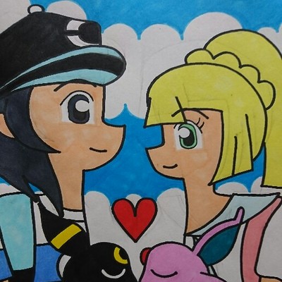 サンムーン本編から数年がたって再会を果たしたヨウとリーリエ、そして初対面でいきなりキスまでしてしまうほどのラブラブっぷりのヨウのブラッキー♂とリーリエのエーフィ♀です~。サンムーンの攻略本のインタビューに主人公とリーリエは太陽と月のように共鳴し合う関係とあったのでそれと同じように月と太陽のように共鳴し合うブラッキーとエーフィがそれぞれヨウとリーリエの手持ちになってたらいいな~って思って描きました。ヨウがブラッキーを持っていてリーリエがエーフィを持っているのは太陽の様に光り輝くヨウにはげっこうポケモンのブラッキー、月のように美しく輝くリーリエにはたいようポケモンのエーフィを持たせて離れていた時もヨウとリーリエが常にお互いの存在を感じていられるように…っていう構図にしたかったからです~。