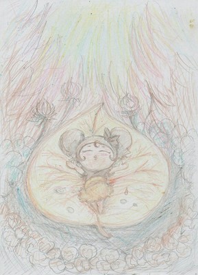 夢の中では主線は筆ペン、着色は色ペンだったが、実際の絵は鉛筆や色鉛筆やクーピー等で描きました。(お絵描きしてる下の子の横で描いてたからですが)