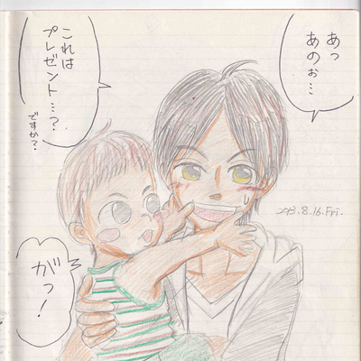 <div align="center"> <strong>[1枚目]</strong> 黒澤くんとうちの息子が同じ誕生日だった事に 驚愕して(笑)、お祝いを兼ねたらくがき。 黒澤くん子供の扱いめっちゃ上手そう(^_^) <strong>[2枚目]</strong> 娘のユノム当時小学1年生、夏休みの宿題で 交通安全のポスターを描いたんだけど、 こんなクマちゃんを描いてたのね(^_^) 真壁っちがいたら楽しそうだなと思い、 ノートの中でこっそりコラボ(笑) <strong>[3枚目]</strong> 息子が赤ちゃんの時、プ◯キュアの衣装を 着せた事がありまして、たまたまふっと 思い出したのかな? 秋月姉弟の中で こんなひと幕があったのかも…という妄想(笑) <span style="text-decoration: underline"><a href="https://plus.fm-p.jp/u/shiokitami/gallery/canvas?id=21&bid=13">←#16へ戻る</a></span> <span style="text-decoration: underline"><a href="リンク先のURL">#18へ進む→</a></span> </div>