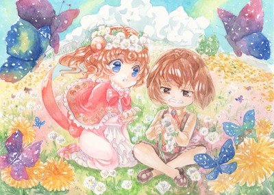 大切な人へのプレゼントに花冠を作ってる様子を描きました。