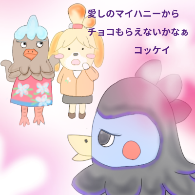 あつまれどうぶつの森のクロベエ君としずえさんとパタヤ姐さんを描きました😊バレンタインが近いので🍫