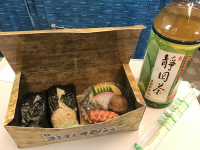品川駅で買った、静岡茶付きおにぎり弁当(500円)を食べながら、三島・新富士間で富士山を見たりと静岡まであっという間でした。晴れていたので、富士山や南アルプスも良く見えました(^O^)三島~新富士の間でアナウンスが流れます♫
