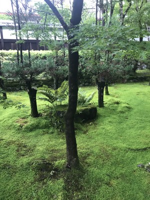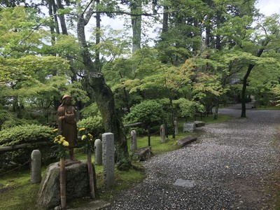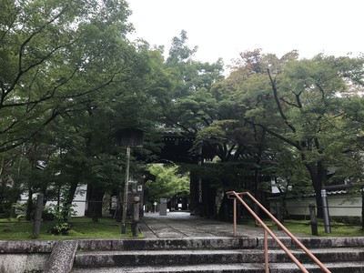 昼食後は、タクシーで真如堂へ行きました。大通りから細い道に入った所にあったので、分からないと迷ってしまいそうでした。最寄りのバス停からも少し歩くようです。真如堂は広い境内に、青もみじに囲まれた三重塔が建っていました。近くで見ると大きくて立派な木造の造りでした。書院や庭園は、コロナの影響で見学不可でした。こちらは、閻魔大王に安倍晴明を蘇生させた伝説や、京都映画発祥の地とも言われています。