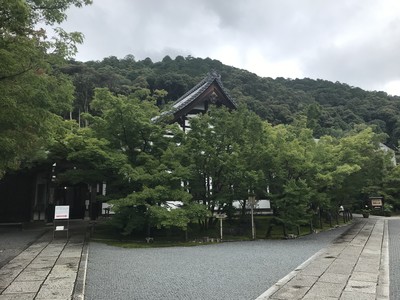 14時頃に、永観堂からすぐ近くの南禅寺を観光しました。南禅寺はそこそこ観光客が居ました。巨大な三門は有料で上に上ることが出来て、そこから景色を一望することができます。戦国時代に石川五右衛門が『絶景かな!!』と感動の台詞を言った有名な門です。雨は降っていましたが、広大な景色を見られました。遠くに見えたホテルみたいな建物が気になりました。三門を降りた後、法堂の雲龍図を見上げて、流れの速い水路を進み、水路閣へ向かいました。