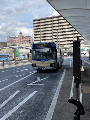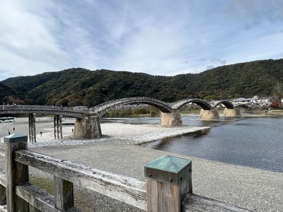 岩国駅は開放感がある大きな駅でした。バス停は行き先や時間が大きく書いてあるので分かりやすかったです。岩国バスに乗り、住宅地からいつの間にか山が見えて、25分で錦川が流れる錦帯橋に着きました。※岩国バスは令和4年12月時点でパスモやスイカが使えなかったので注意です。