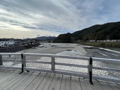 錦帯橋はそこそこ人数がいました。紅葉シーズンだと混雑だったと思われます。錦帯橋を渡るのは有料で、岩国城入場+ロープウェイ券付きだとお得です😊錦川の河原にはバスが数台停まっており、屋台もありました。