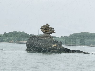 12時40分に船着き場に並ぶと、小雨で傘を差さなくて良い位になりました。良い席を目指す場合は20分くらい前から並ぶと良いです。12時50分位に仁王丸が帰ってきて、前の人が降りた後直ぐに案内されました。1階の前から二番目の右側に座りました。2階はグリーン席で600円掛かります。出発すると女性のアナウンスで島を説明してくれて、モニターでも位置を確認することが出来ます。出発して直ぐにクジラとカメに似たふたご島を見ることが出来ます。いくつかの島を紹介すると外海に出て、少し波の揺れを感じました(船酔いしやすい私でも問題ない位の揺れでした)塩釜漁港が見えたり、カキの養殖地も見えました。松島の名所、4つの洞がある『鐘島』や島の天辺が仁王像に似た『仁王島』は最徐行で通ってくれました。