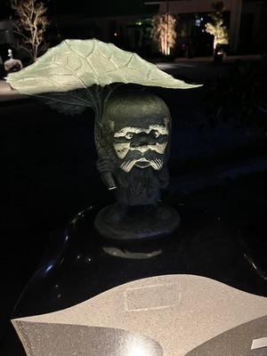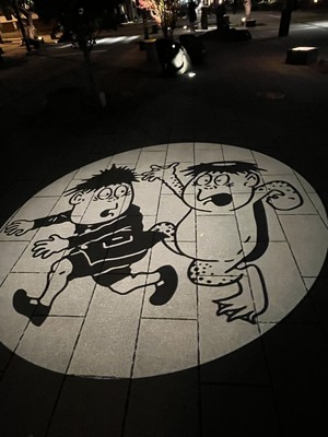 部屋に荷物を置いて、夜の水木しげるロードを散策しました👻夜の9時近くだったのでお店は終了していましたが、道に植っている柳の木が不気味さを表していました。道に鬼太郎を始めとする妖怪や悪魔くん、メフィストなど水木しげる作品の銅像が置かれていました😊地面に鬼太郎などの絵が描かれたライトが照らされたりと、夜の散策が楽しかったです。