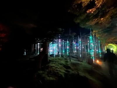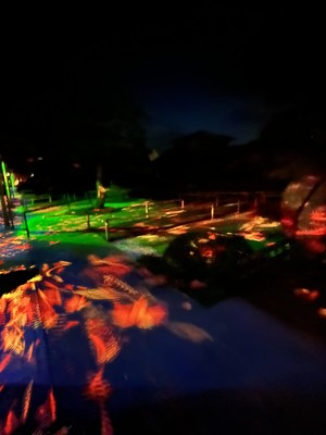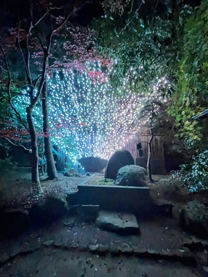 由志園に入ると、地面にプロジェクションマッピングの紅葉が映し出されたり、紅葉が七色にライトアップされていました。黄金や紅色に輝くイルミネーションの道を通ったり、花札が並ぶイルミネーションもありました✨大山と月を光で表現していたのも美しかったです。