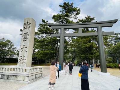 出雲大社は神在月なので観光客が多かったです。二の鳥居に着いて、ガイドさんが廃駅となった出雲大社前駅の写真を見せてくれました(現在は工事中で駅に入れないみたいです)。一の鳥居と二の鳥居の間が神門通りで坂道になっていました。時間がなくて回れなかったですが、広くて多くのお店が並んでいました。二ノ鳥居の西に神迎の道があり、この道から全国の神様が稲佐の浜から出雲大社にやってきます。