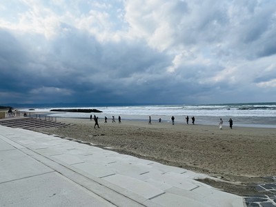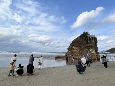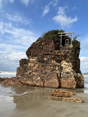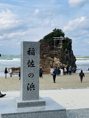 10時頃に稲佐の浜に到着しました🌊ドラクエウォークのお土産スポットです。こちらは風が吹いていて少し寒かったですが、観光客も多かったです。この海岸は神在月(かみありつき)に全国の神様が現れ、出雲大社に向かうといわれています。岩に鳥居が建っているのが特徴的です⛩️ここの砂を持って帰り、出雲大社の素鵞社(そがのやしろ)の砂と交換して、それを家に持って帰ると御利益があるといわれています。波は穏やかでしたが、突然押し寄せて来るので、波打ち際で砂を取るのに注意です⚠️