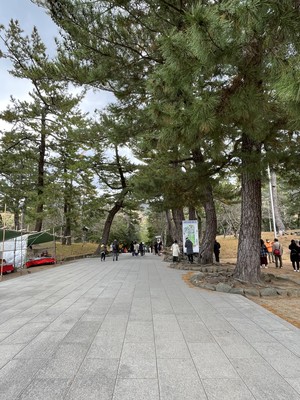 二の鳥居から三の鳥居までは下り坂の石畳の道でした。広場に相撲の土俵が残っていました。三の鳥居と四の鳥居の間は、真ん中の松の参道が通行止めなので端を通ります。端の芝生にウサギの像が多く置かれていましま🐇ガイド終了後に写真を撮りに行きました。