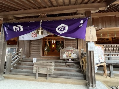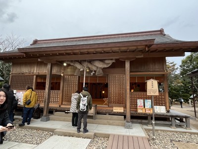 拝殿に大きなしめ縄が飾らせていました。拝殿周辺は多くの人で賑わっていました。拝殿の後ろに本殿があり多くの人が参拝していました。本殿と拝殿の東西に長屋のような社、十九社があり、神様のお宿です。空いている宿に参拝した人が多かったです。