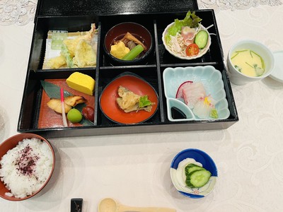17時頃 出雲平田のホテルで松花堂弁当を食べました😋量は少なめでしたが天ぷらや刺身、生ハムなどバラエティー豊かでした🎵食事は1時間でしたが、ここからバスを70分走らすのでビール等は控えました。