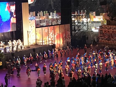 しゃんしゃん祭は因州和紙と鈴を付けた色鮮やかな傘を回しながら舞う踊りです。傘の動きがピッタリと合っていて華やかでした♪3曲流れ、北島三郎氏が歌う音頭に合わせ踊っていたり、現代風なテンポの曲にも合わせて踊っていました。民謡から現代曲まで幅広く合う舞でしたね(*^-^*)