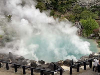 海地獄は美しいコバルトブルーですが、モクモクと湯気がたっていました‼️ギャラリー青の2階テラスから見ると大迫力でした。ギャラリーは資料館になっていて、クイズや雑学などもあり勉強になりました。海地獄の写真も飾らせており、可愛い鬼の写真がありました☺️