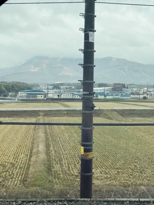 海沿いを通りますが、景色は田園風景と中津付近で山が見えました⛰️この辺りは日が少し差していました☀️中津駅は福沢諭吉ゆかりの市なので、デパートに大きなポスターが掲げてありました‼️