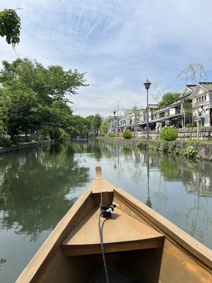 10時30分に船流し体験をしました。所要時間20分で、2隻の船が水路の中心から反対方向に出て、中間地点ですれ違いました。船頭さんから美観地区の新しいお店を教えてくれました。また、江戸時代は瀬戸内海から倉敷まで舟で物資を運んでいたなど歴史も聞くことが出来ました。