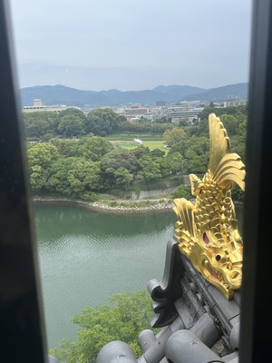 天守閣の最上階では金のシャチホコを近くで見られたり、旭川や後楽園の芝生が見えました。