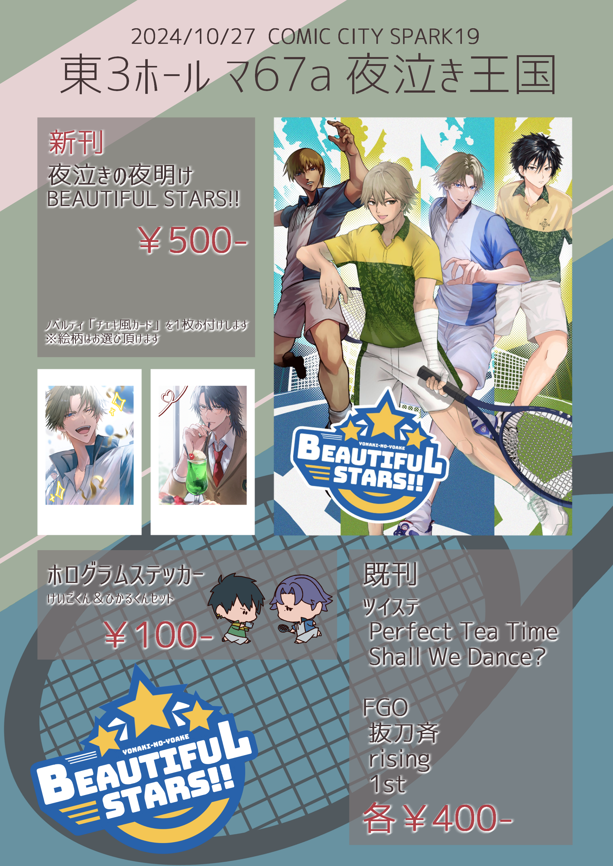 新刊合同誌【夜泣きの夜明けBEAUTIFUL STARS!!】の他、既刊やステッカーも置いてあります。