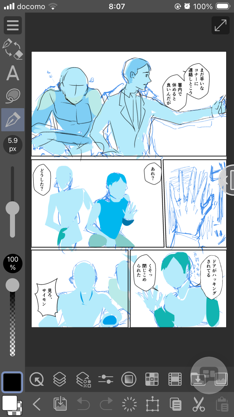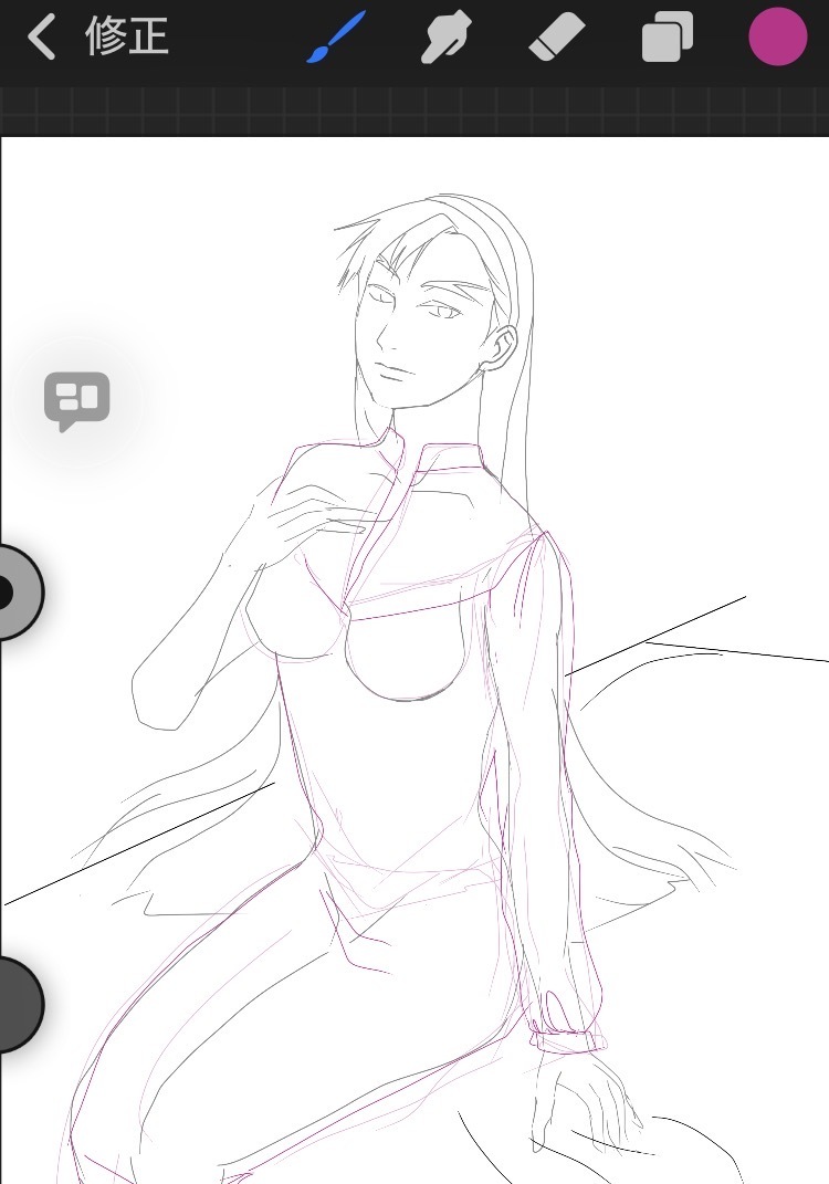 スタイラスペンも感度があんまり良く無いので基本は指で。縮小状態で全体をざっくりあたりとり(線で取るよりも投げ縄塗りの方がいいかも)→なるべく縮小したままラフ→拡大しながらペン入れ