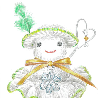 {◎いただいた物です。『好都合な呪文』の「ちびクル」のモデル。本来は麦わら帽子の女の子。緑の羽、雪のチャーム、杖は後から付け足しました。リボンに添えてる感じ…この杖は鉢植え用ピック。カミールの杖と、おそろいで。背丈は10cmほど} #6aumkuchen ***[2020年]