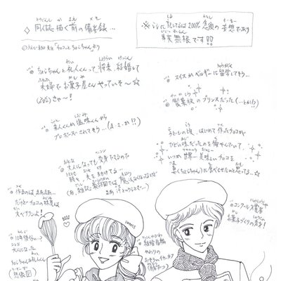 ◇大人姿…ちょこちゃん&礼人くん {◎制作は未定…マンガにする時は中学生くらいにしようと思ってます。この設定は急須(わたし)の妄想であり事実無根です!! (^o^;)} ◇星野ちえみは普通の中2の女の子。ある日、幼なじみの礼人君と行った博物館で、遺跡から発掘されたチョコを口にしたら変身の魔法が身について…!◆ちょこ、礼人(学年主席で学校では星野さんと呼んでる。弟と仲が良いのを気にしてる…)学校で製菓クラブに入ってる。あと後輩1年は「03巻小さなお友だち」「ゆめみちゃん」と「来人君」(…兄より背が高い、女子に人気、ちょこちゃんが兄ちゃんを好きなのを知ってる。半分本気で、ちょこちゃんが好き←黒田センパイのセリフのパクリ「ゆう&YOU」01巻より。なので告白しても彼女の恋を応援してる…)とか何とか…私的アレンジです。 ◆変身呪文 メルティング〜テンパリング〜 クーリング…チェンジ! (Melting,Tempering,Cooling…Change! =溶かして、ひろげて、冷やして変身!) ◆アイテム「チョコの小箱」…バレンタインチョコみたいな高級な箱に入ったチョコのイメージ。この話のみの設定です。すみません、勝手な妄想です。原作にこんな描写はありません。うえだ未知先生に怒られるかもしれません(……と思ったら「ドッキリひみつ」ちょこちゃん部屋には「ひみつの小箱」が描かれている〜☆まんざら妄想ではないかも!?) [2021-r3]***