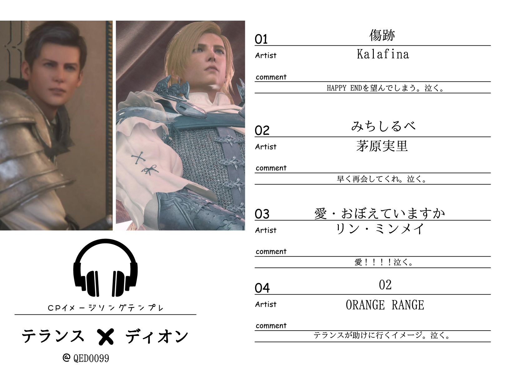 20241013(日)21:02コメントする ( 2 )手紙というかメモというか、鼻歌ふんふん〜♪てディオンが紙に書いてる、テランスはその内容を知らないけどあまりにも楽しそう……でも音が少し外れてる、鼻歌が可愛くてハモリにいく、そしてサビでガチ歌、ヾ(*´∀`*)ノキャッキャしたディオンに歌を聴かせて、ソファにえーいって二人して転がった後にべったりくっついたまま「何書いてたの?」って聞いたらにんまり笑ったディオンが「お前へのラブレターだ」って追記