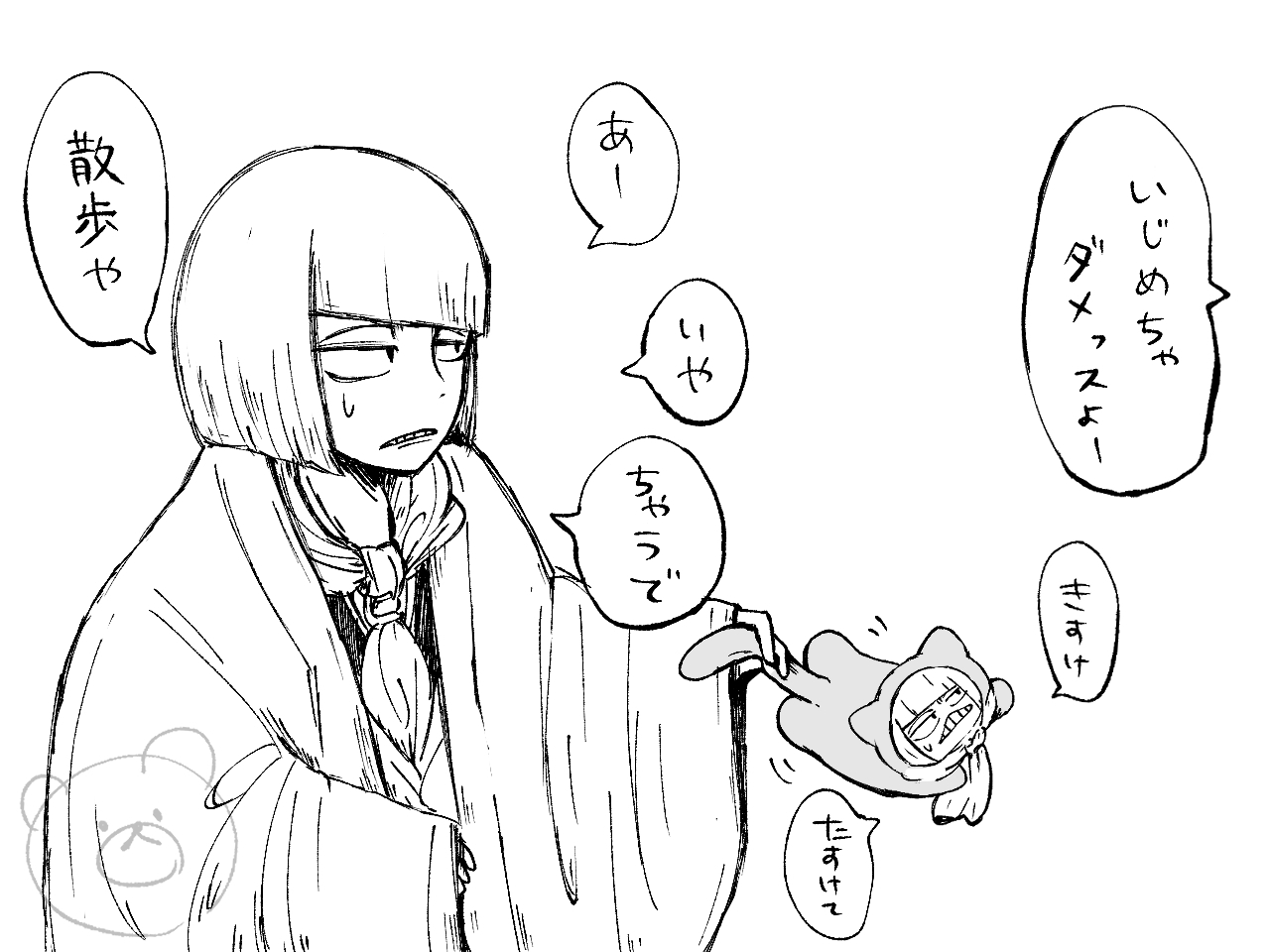 声帯の作りの差なのか知能の差なのかも不明だか、ちみこい浦原はちみこい平子と違い、人の言葉を喋らない。猫のような声でひと鳴きしたちみ原を肩に乗せ、廊下まで響く平子たちの声を辿って客間に向かった。×浦