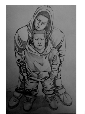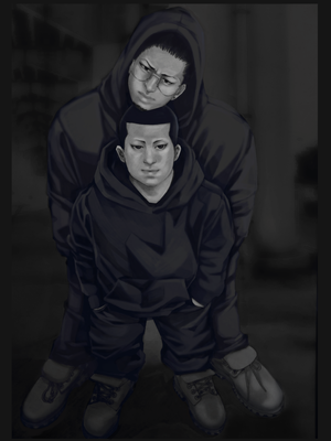 お揃い可愛いコーデだけど、抜けきれない柄崎の子犬感。