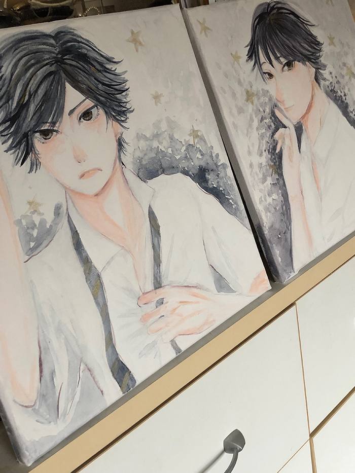 双子をテーマに描いているわけですが、実は同モチーフで過去に企画展に参加しています。昨年7月に大阪のギャラリーで開催された「制服男子耽美展」に出展していました。
