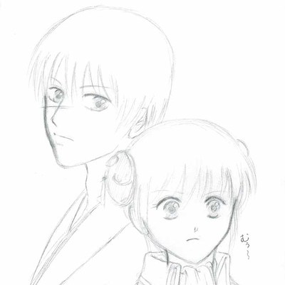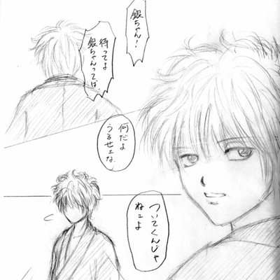 「よォ、土方くん。一人寂しく非番の日を持て余してんの?」 「別に持て余してなんざいねェよ。うぜェからどっか行け」 「何それ? せっかく声をかけてあげてんのに、そんな言い方はないっしょ」 「俺はんな事頼んだ覚えはねェよ。突然勝手に湧いて出たのはオメェだ」 「ひでェ言い方。銀さん傷付いちゃったなァ。……お詫びに飯おごってくれよ」 「はァ!? 何で俺が?」 「銀さん、心も財布も傷付いちゃってんだよね。だから、さ」 「知るか! どうせパチンコでスっちまったんだろ。大体そんな事して、俺に何のメリットがあるってんだよ」 「そこはほら、銀さんと一緒の時間を過ごせて、銀さんを独占できるっていう素敵な特典があるわけよ」 「……勝手にほざいてろ!」 とかなんとか言いながら、結局おごっちゃいそうだよね、土方さんって。 そんな感じで妄想しながら描いてたっぽいお絵かきです。 今までよりも少し引いた位置で、しかも二人というのは凄く難しかった……! もっと肩幅が必要なのは分かってるんだけど、どうしても釣り合いが取れません。 一応写真を見ながら描いてるんですけどね、これでも。 まぁ少しずつ描いていくしかないな。 あ、一応二人とも着流しのつもりです。はい。 12/27 前へ:坂田銀八 次へ:沖田と神楽