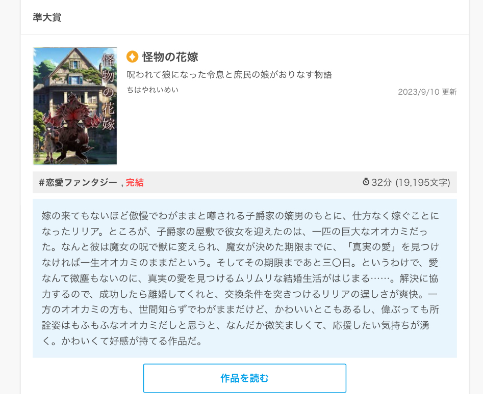 新星ファンタジーコンテスト、ふわふわで「怪物の花嫁」が準大賞受賞しました。ありがとうございます!