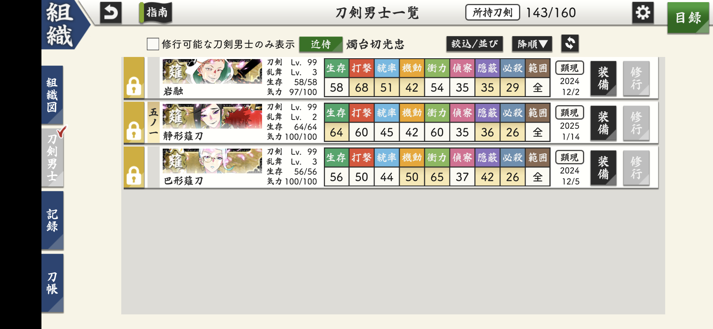 今は短刀を12振りくらいを入れ代わり立ち代わり部隊編成してレベリング中。