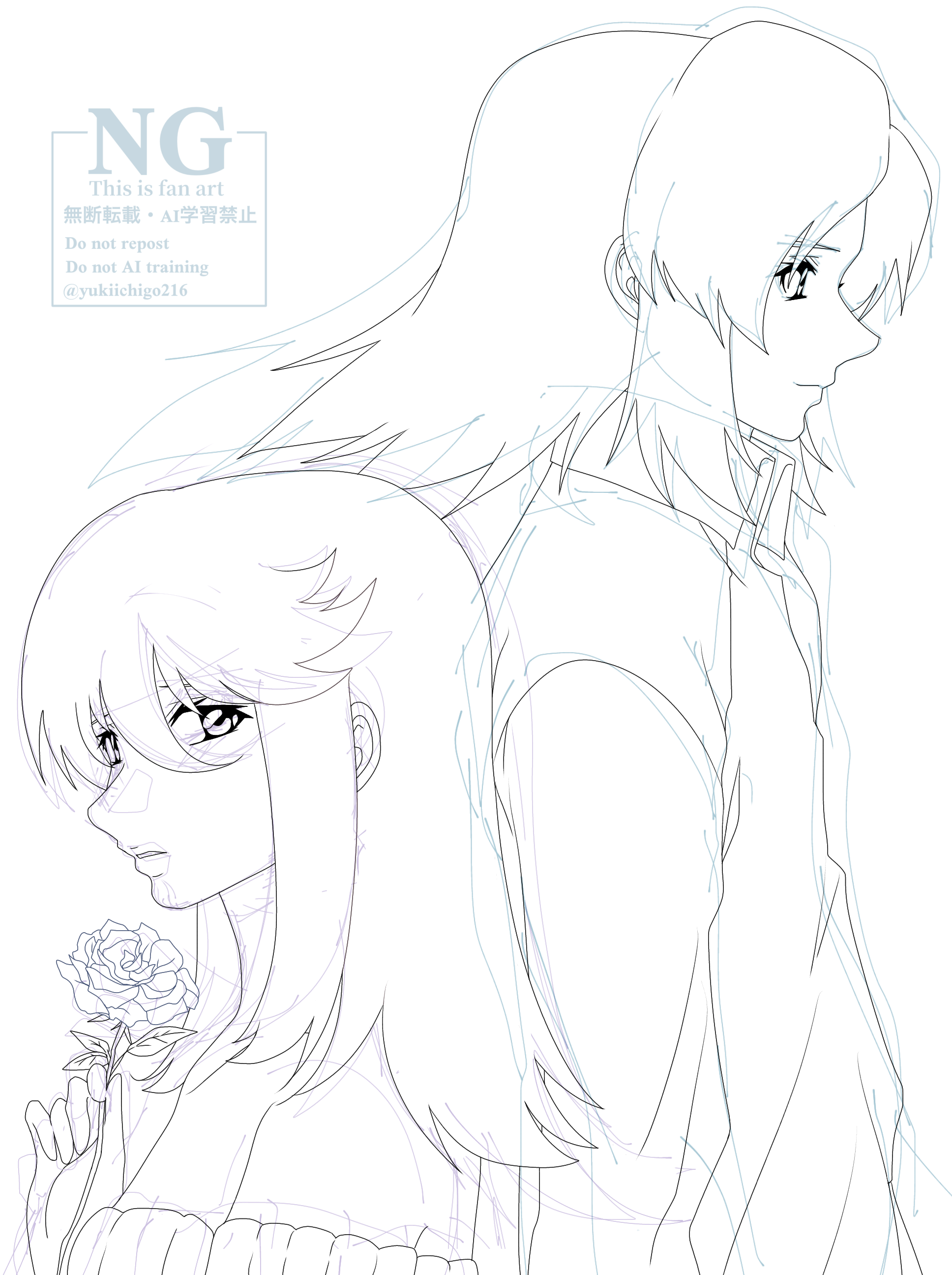カードでは完全に背を向けてたオルフェ、ちょっとはイングリットも見てやって!!な気持ちになってしまいました💦というかアセべの他のオルインも背中合わせとかだしな🥲でもオルフェ、ほんとに見てないんだろうなぁ…と切なくなりながらこんな構図の二人を描いてしまったんですが。二人の見ている先が見事にすれ違ってます…