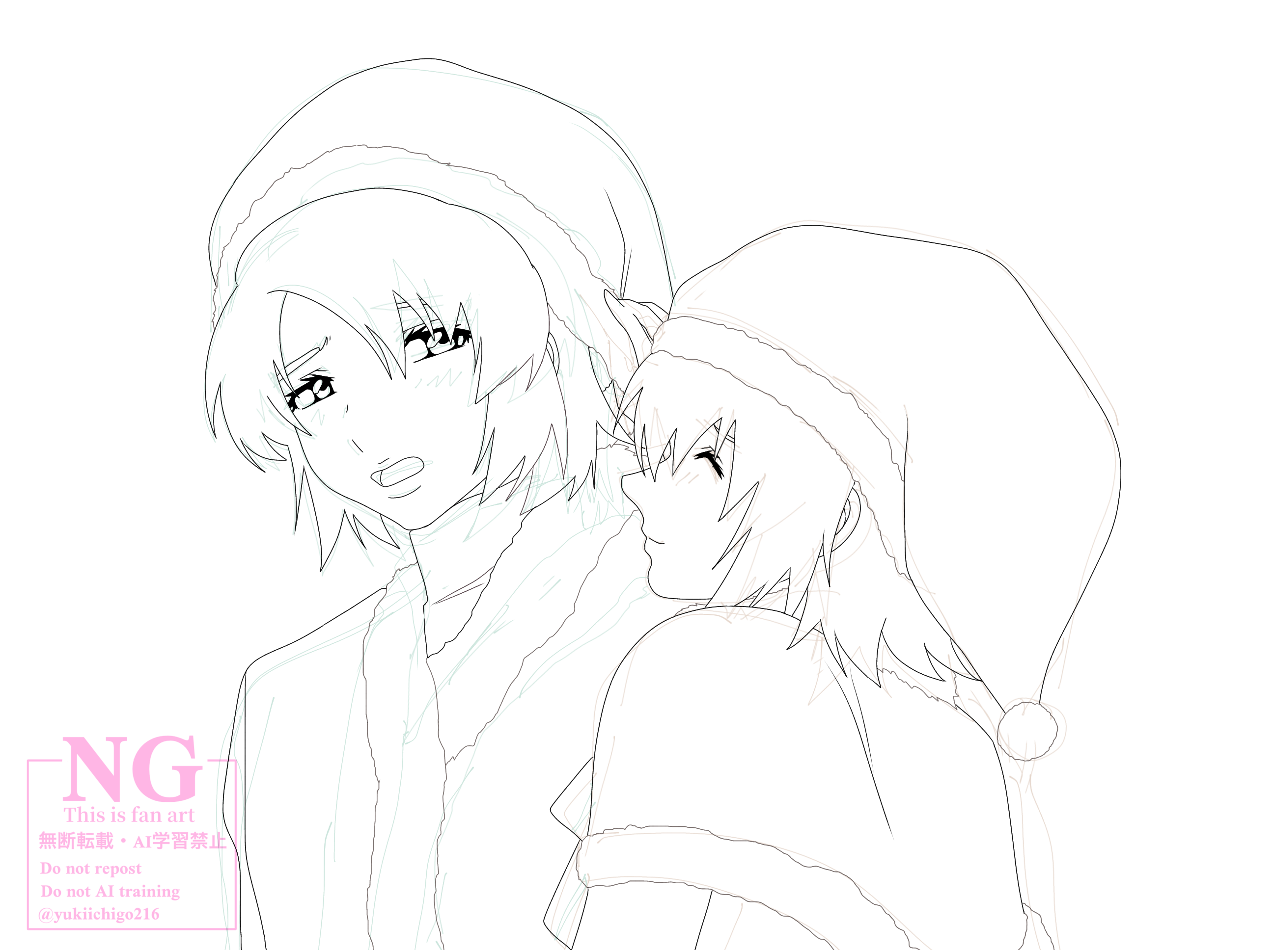 アスラン1人だとサンタ衣装なんて絶対着てくれない気がしますが、隣にカガリがいて「ちゃんと似合ってるぞ」とか言われながら着てくれる&照れてるアスラン(イラストは帽子を直してくれてるカガリ)を妄想しながら描きました❣️サンタコスのアスカガとか絶対可愛い。そしてカガリもサンタさんなのでお揃いですし←重要